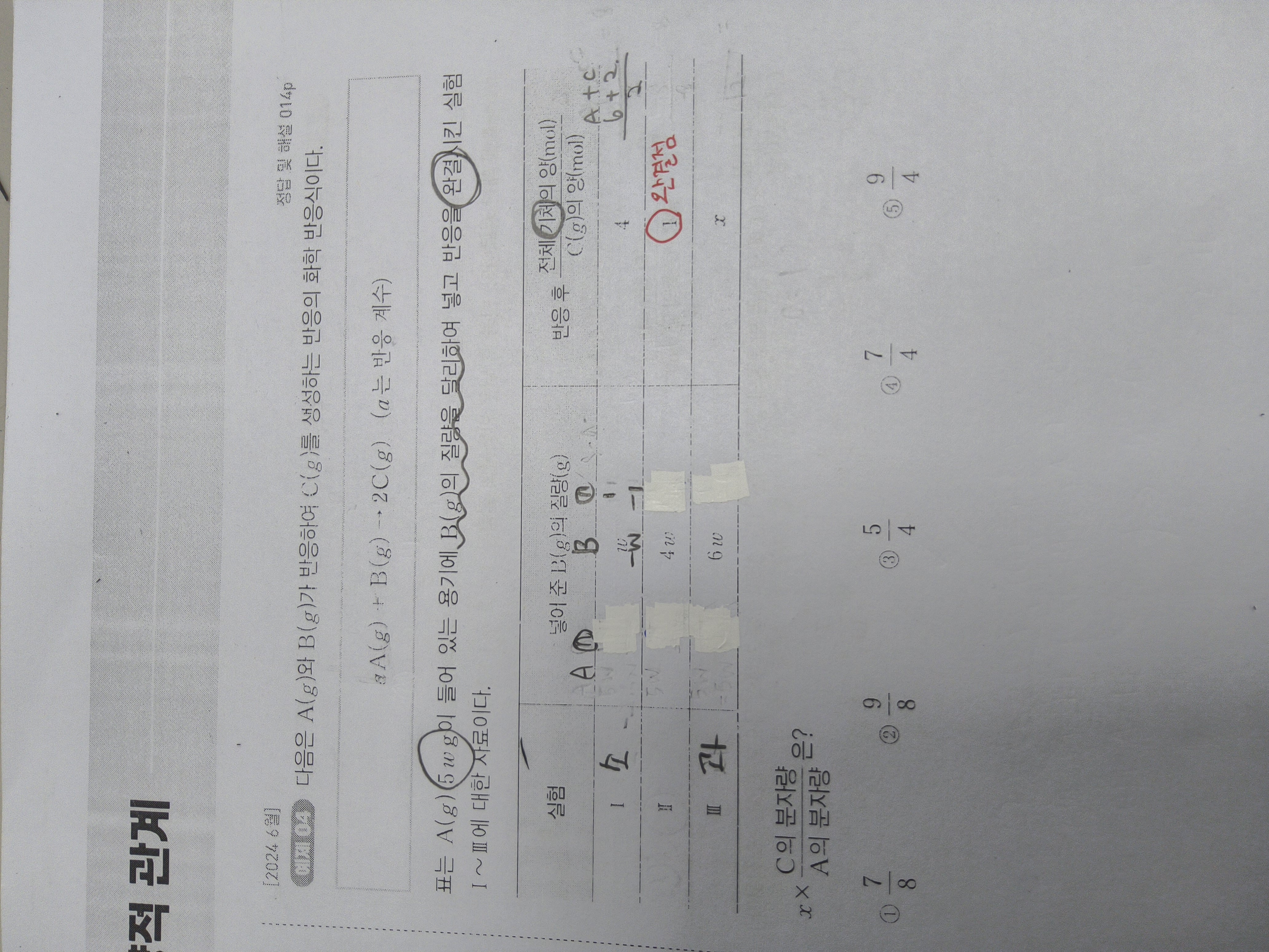 실험 2에서 a 1 남고 c1 생성 d2 생성이고 반응 전 후 질량 동일로 3w = a질량 w/2 c + 2d 이니 9/4 = 2d/a+c = 5w/2 -c / w/2 + c 로 c의 분자량을 구했는데 어디서 문제인가요??