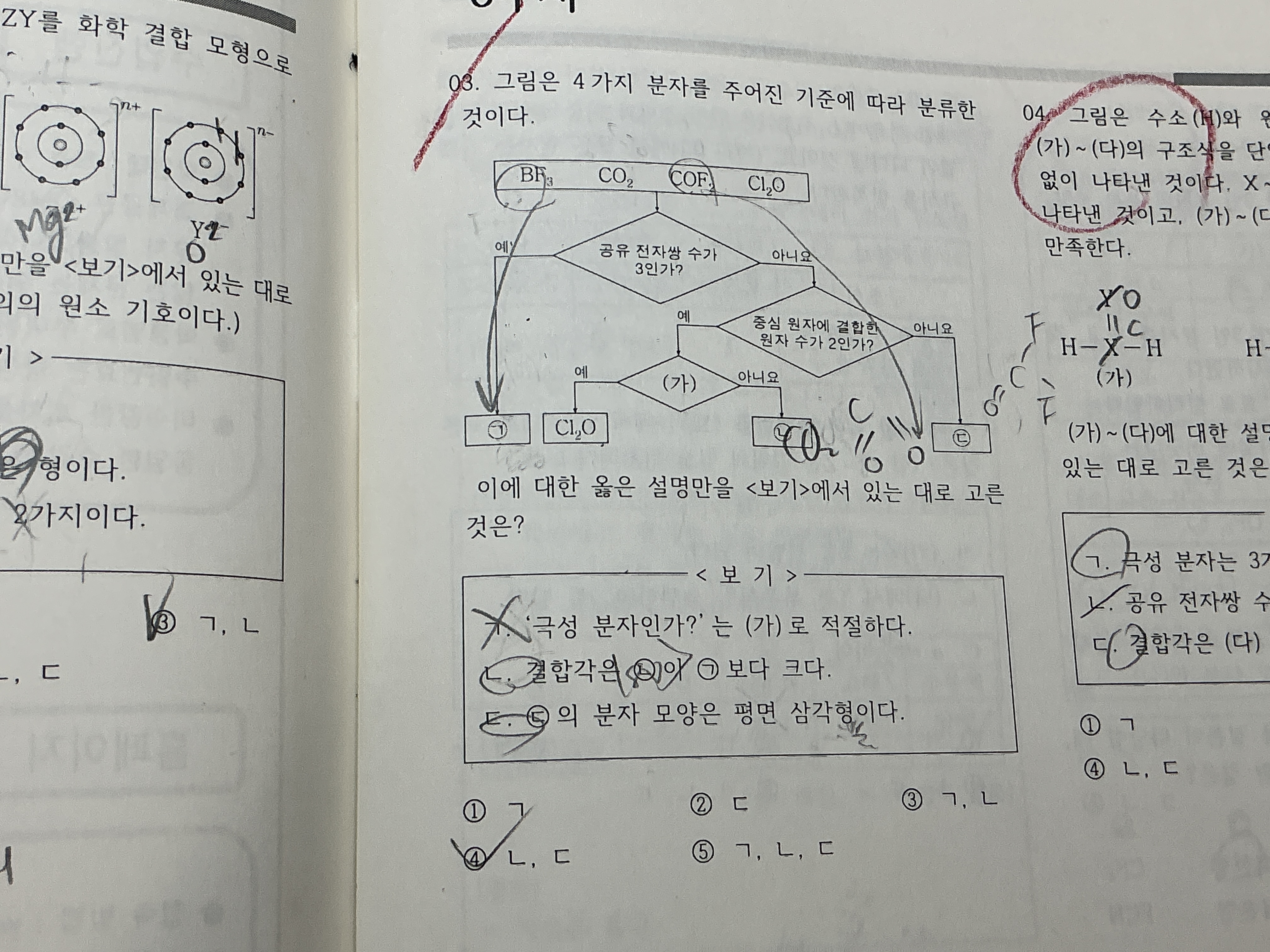ㄱ이 옳은 이유는 무엇인가요? 극성 분자가 분자 내에서 전하 분포가 비대칭적인 것이라던데 맞나요? Cl2O, CO2는 중심원자 기준으로 둘 다 대칭적이지 않나요.?