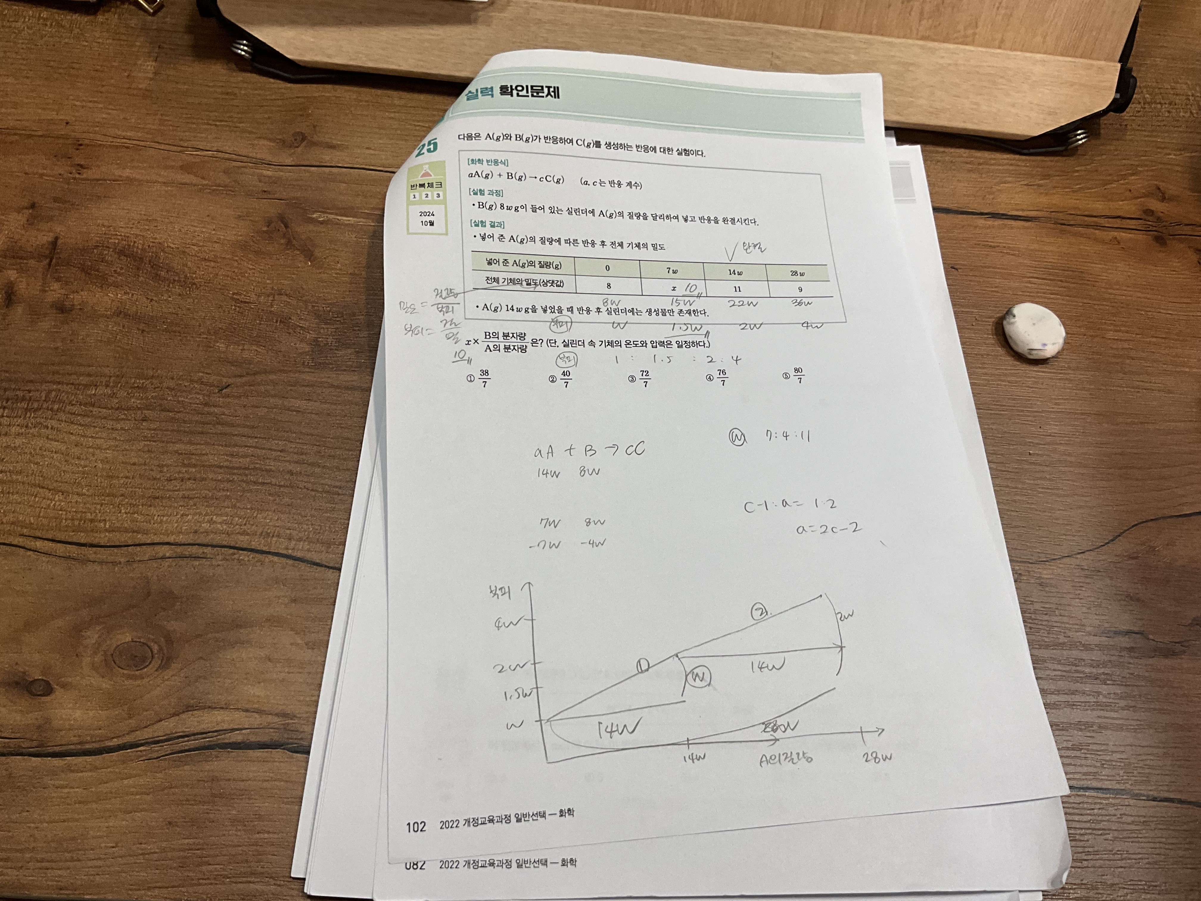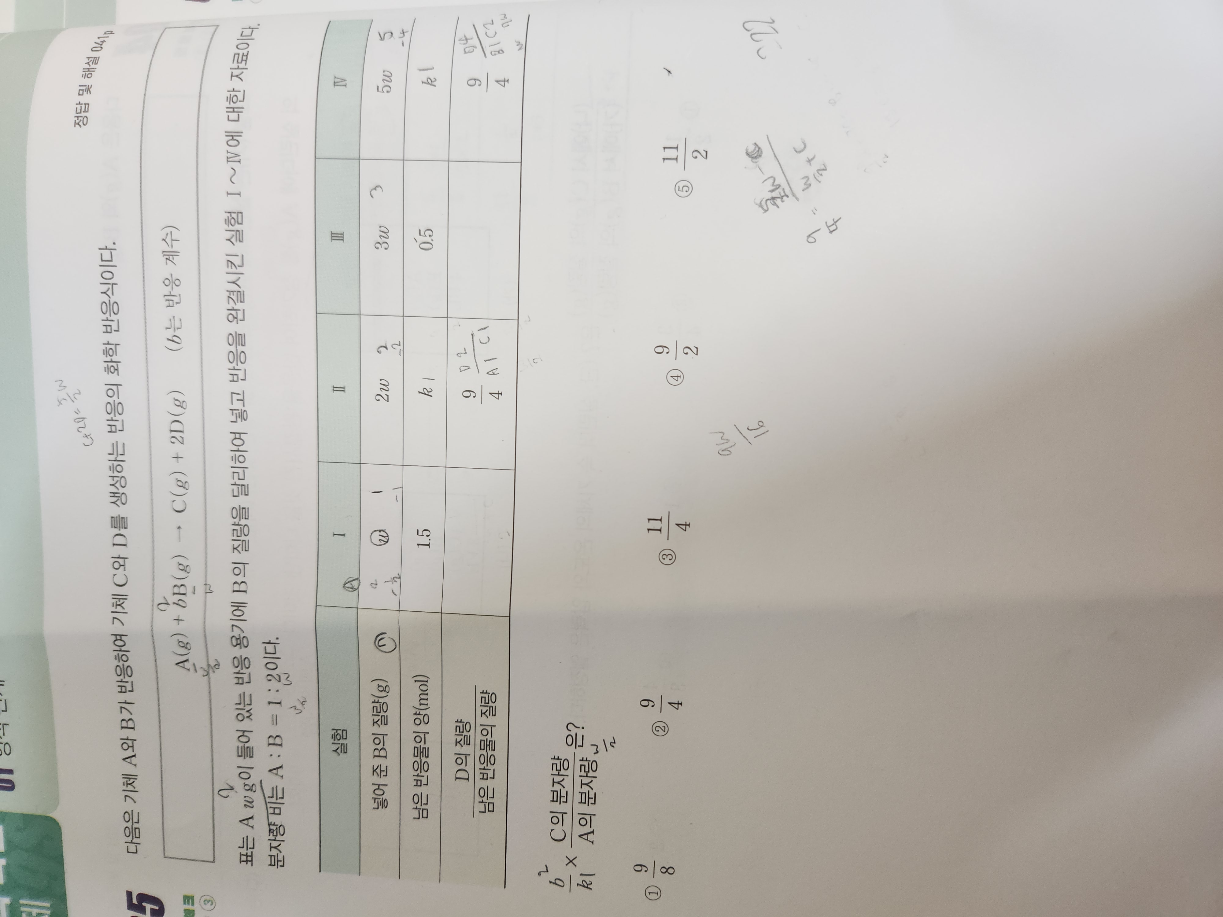 실험 2에서 a 1 남고 c1 생성 d2 생성이고 반응 전 후 질량 동일로 3w = a질량 w/2 c + 2d 이니 9/4 = 2d/a+c = 5w/2 -c / w/2 + c 로 c의 분자량을 구했는데 어디서 문제인가요??