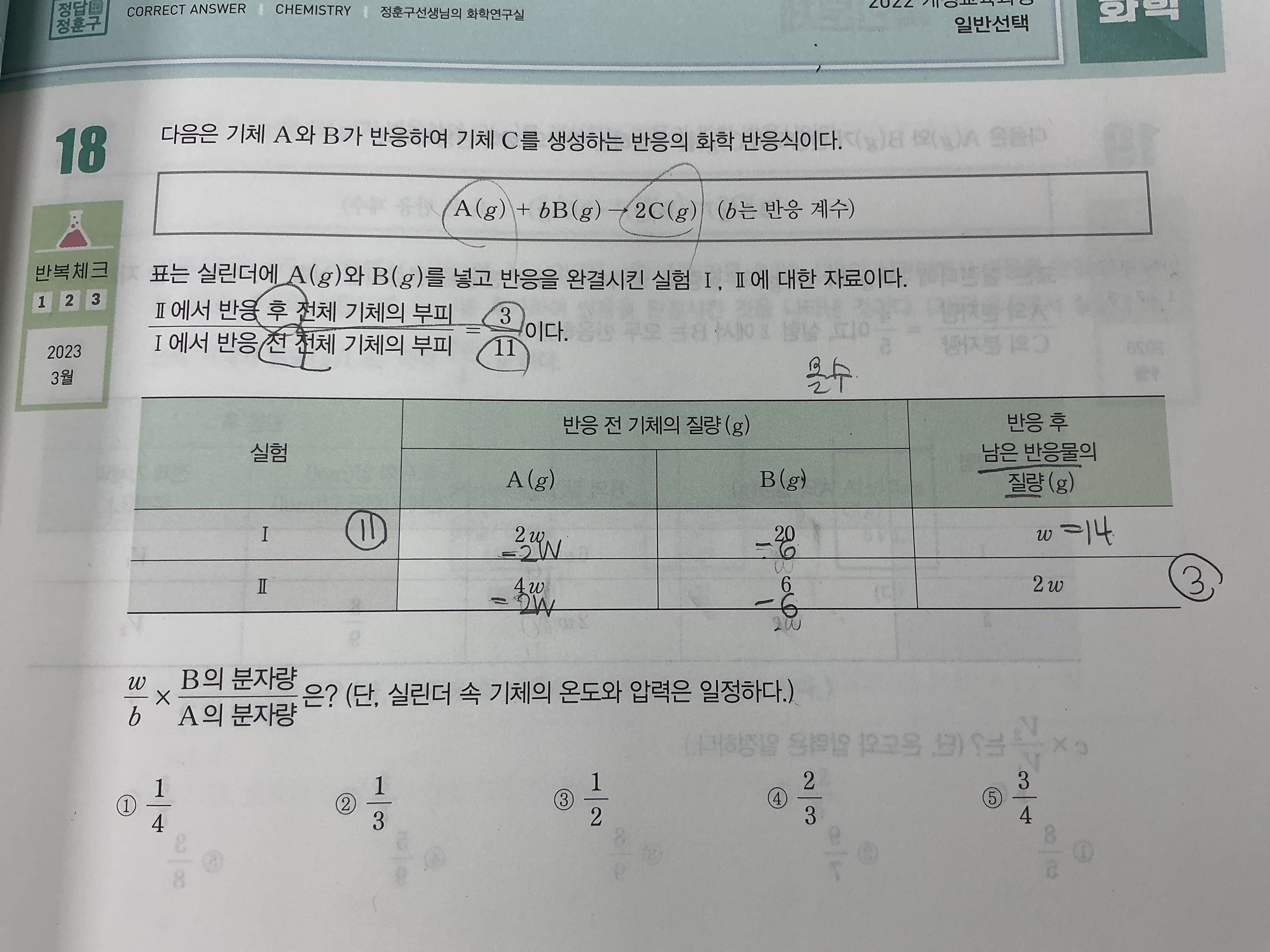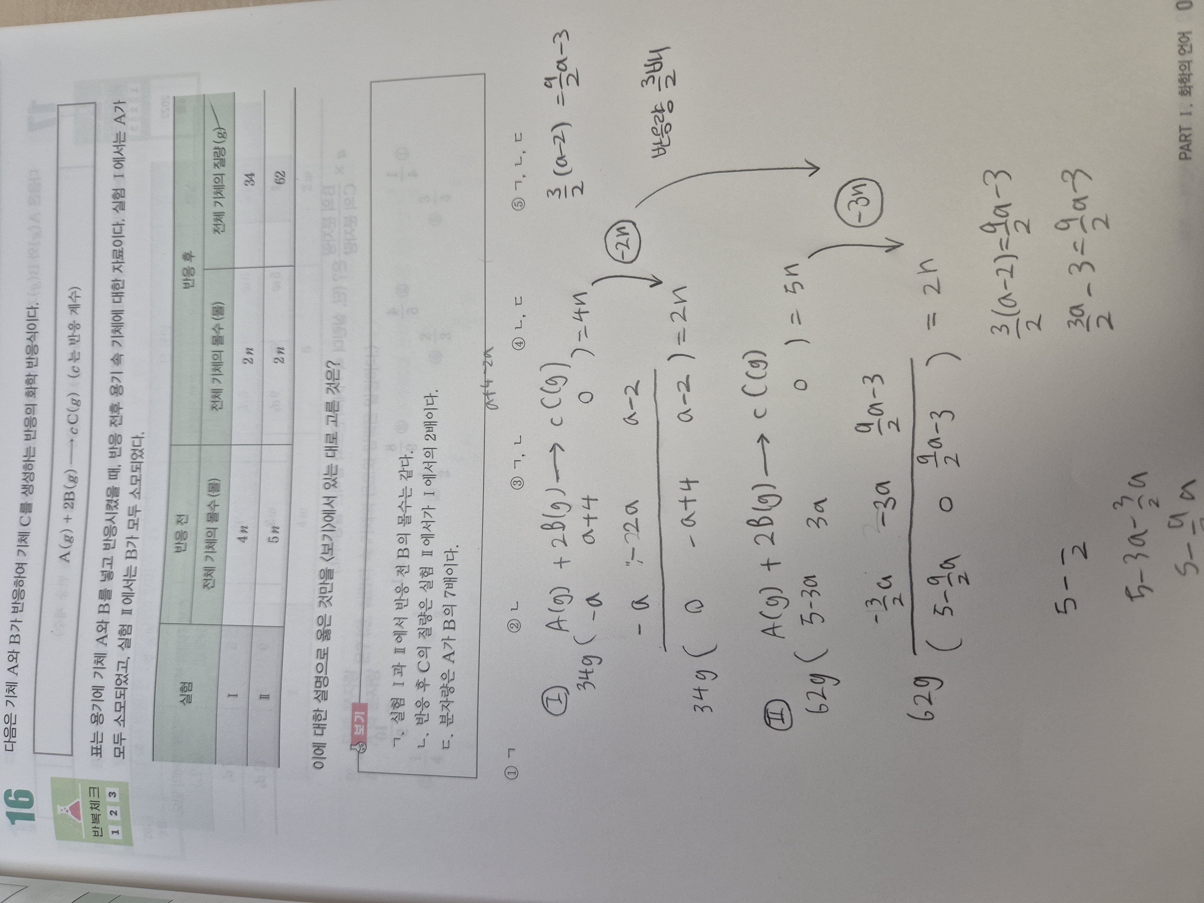 이렇게 (a-2)곱하기 2분의 3을 하면 (2분의 9a-3)이 나오는거가 맞지않나요? 반응량이 2분의 3배면 생성물도 2분의 3배로 풀었는데 답이 a값이 안나와서요…혹시 제가 생각한 풀이에 오류가 있을까요?(a를 몰수로 생각했습니다)