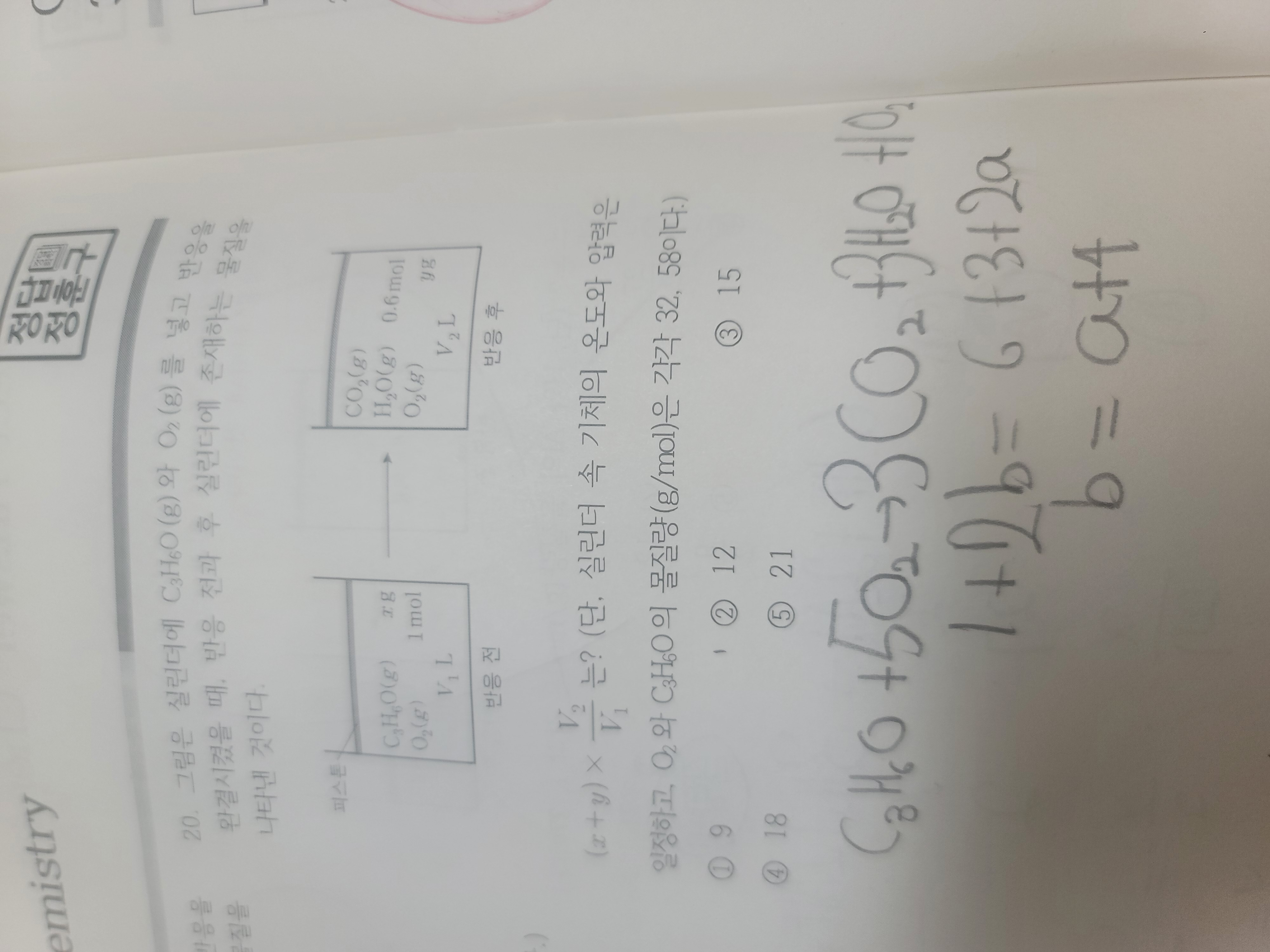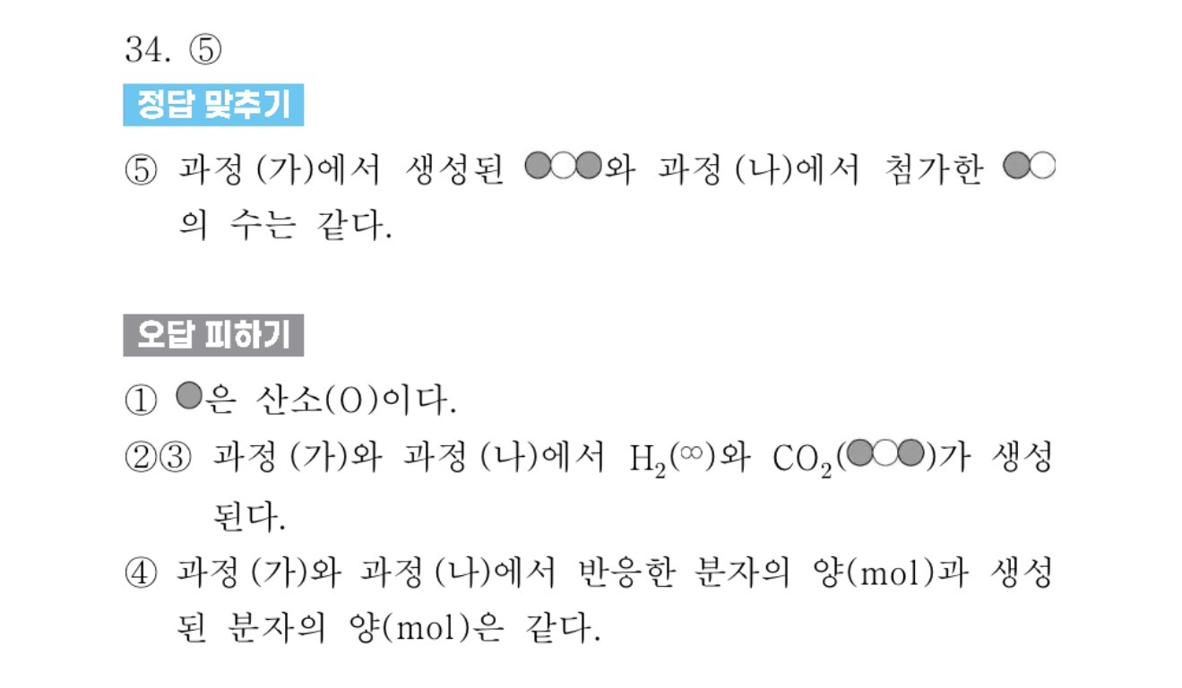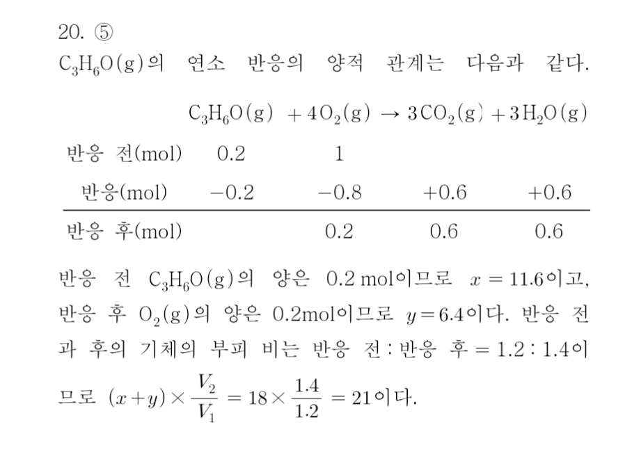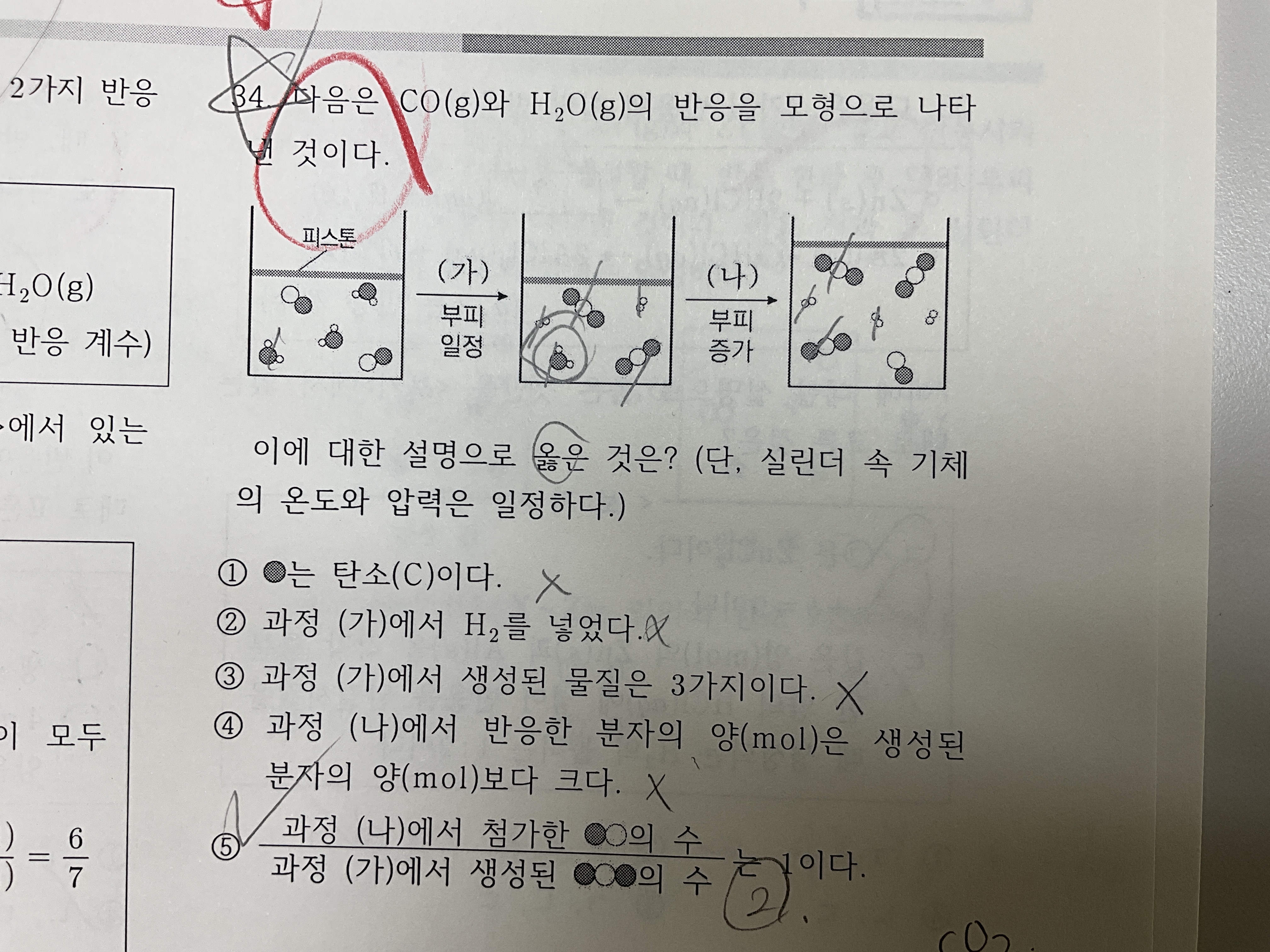 해설 4번선지에서 왜 과정 (나)에서 반응한 분자의 양과 생성된 분자의 양이 같은가요? 부피가 증가했으니까 반응한 분자의 양이 생성된 분자 양보다 더 많아야되는거 아닌가요? 그리고 5번이 왜 맞는건지도 잘 모르겠어요