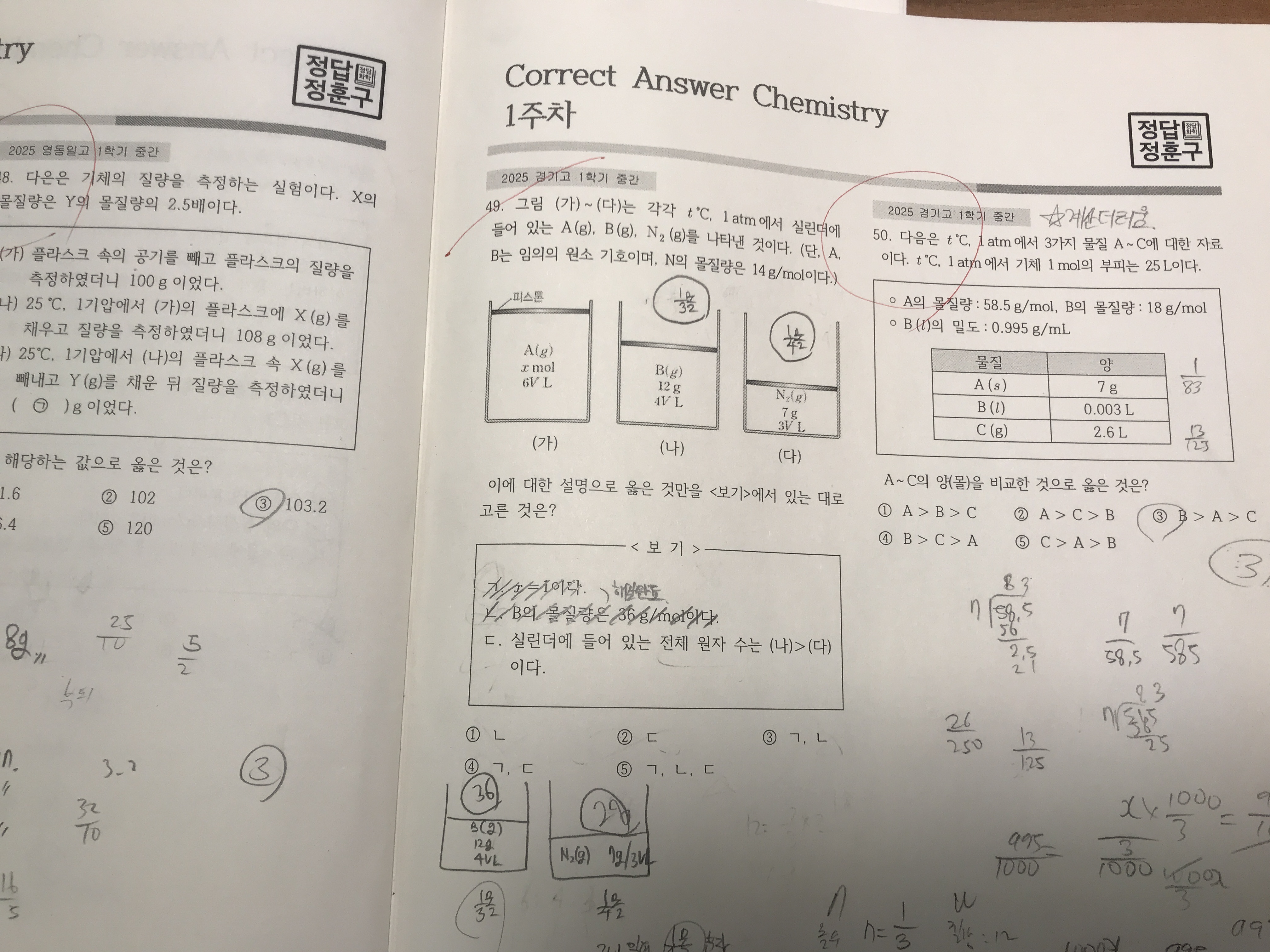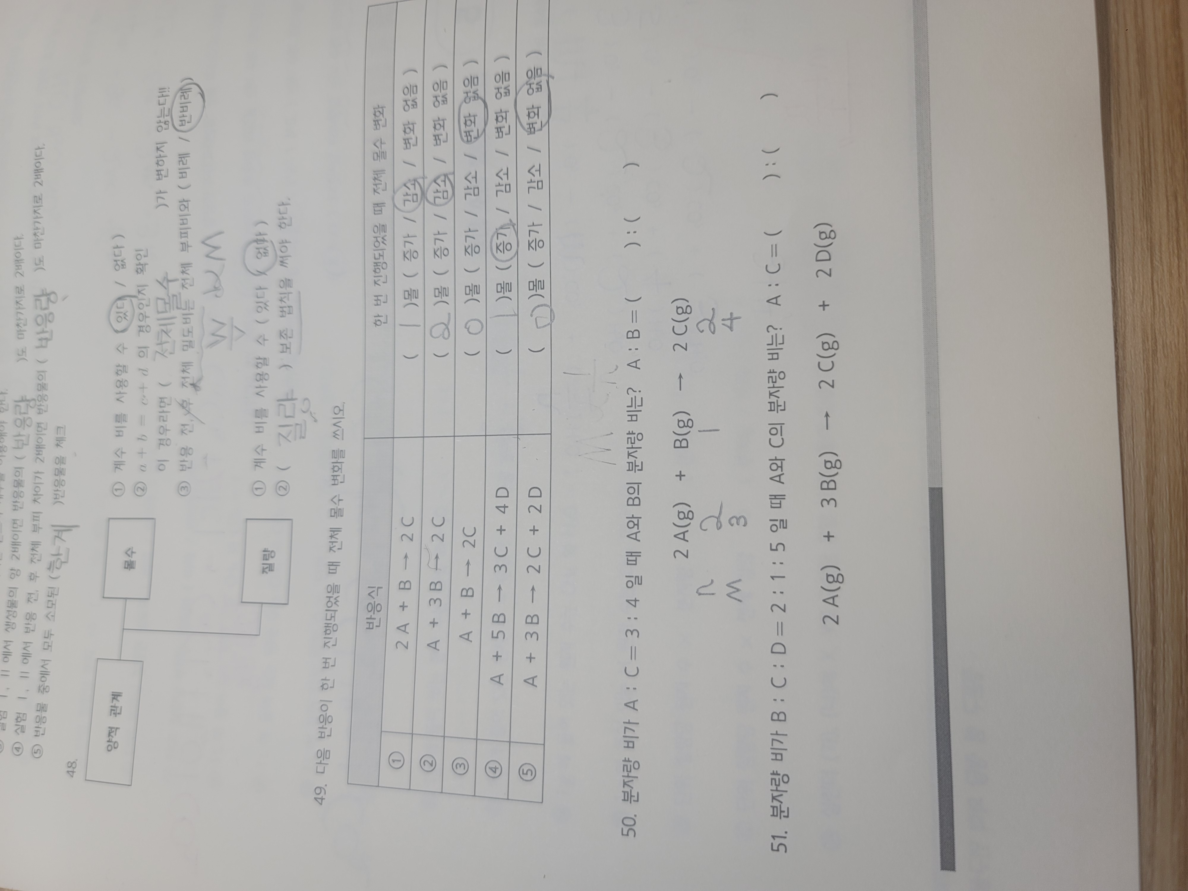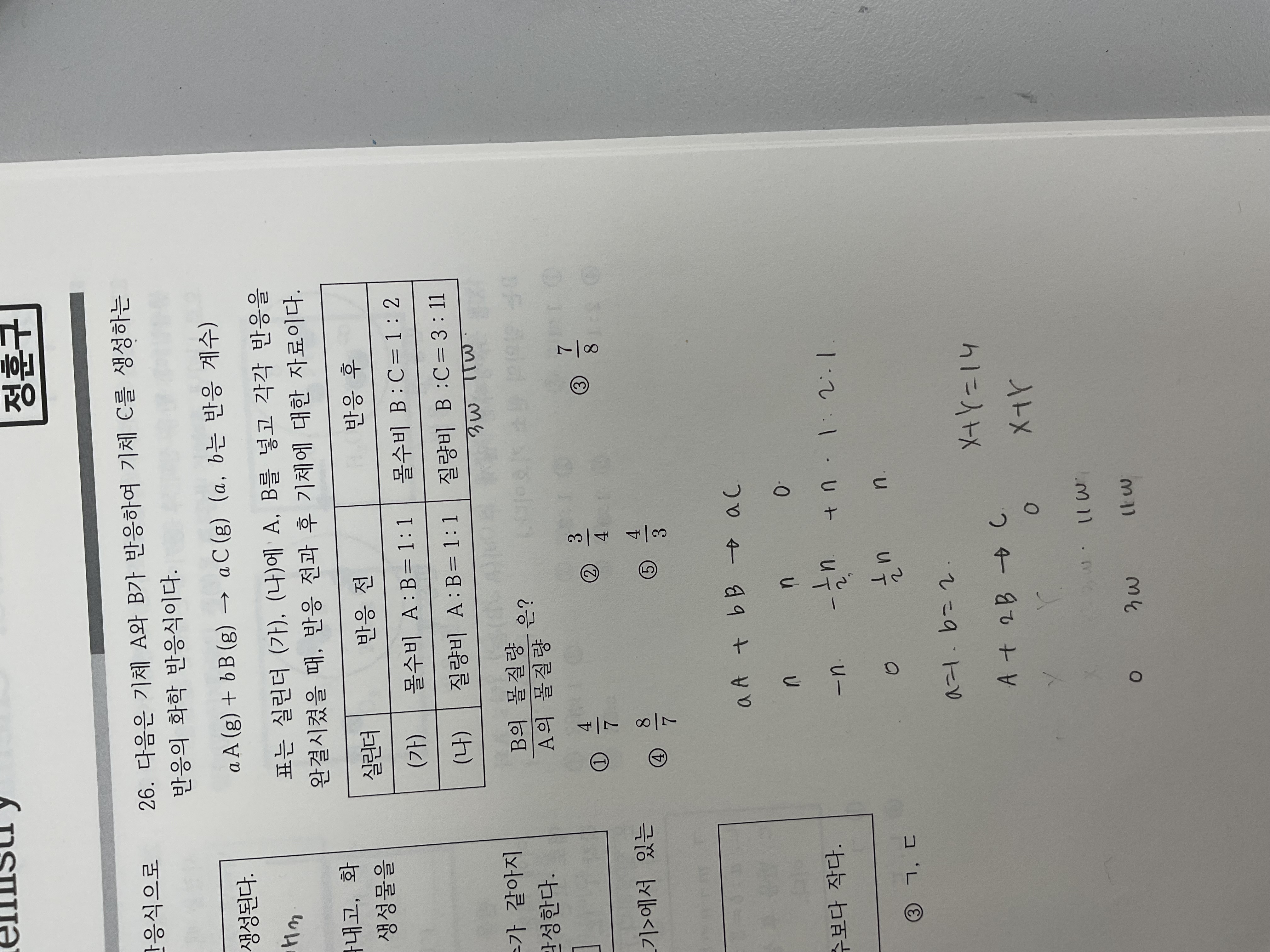 해설 4번선지에서 왜 과정 (나)에서 반응한 분자의 양과 생성된 분자의 양이 같은가요? 부피가 증가했으니까 반응한 분자의 양이 생성된 분자 양보다 더 많아야되는거 아닌가요? 그리고 5번이 왜 맞는건지도 잘 모르겠어요