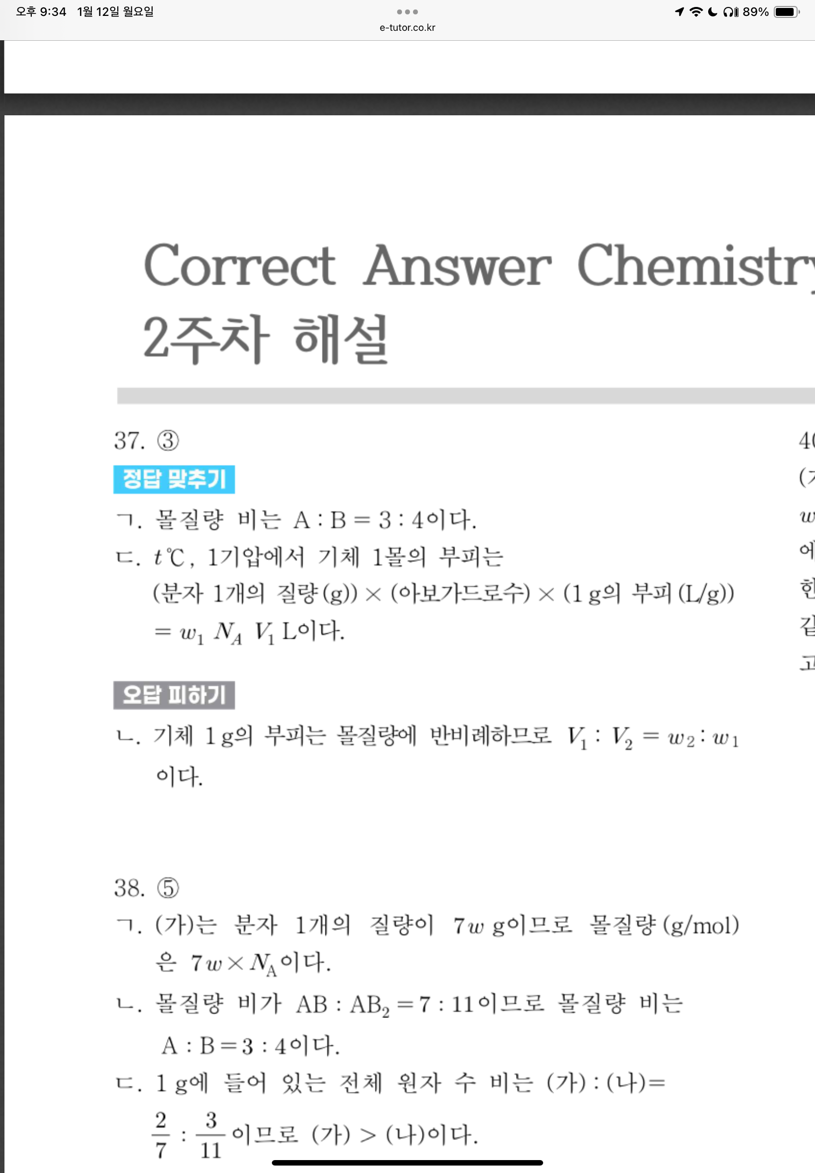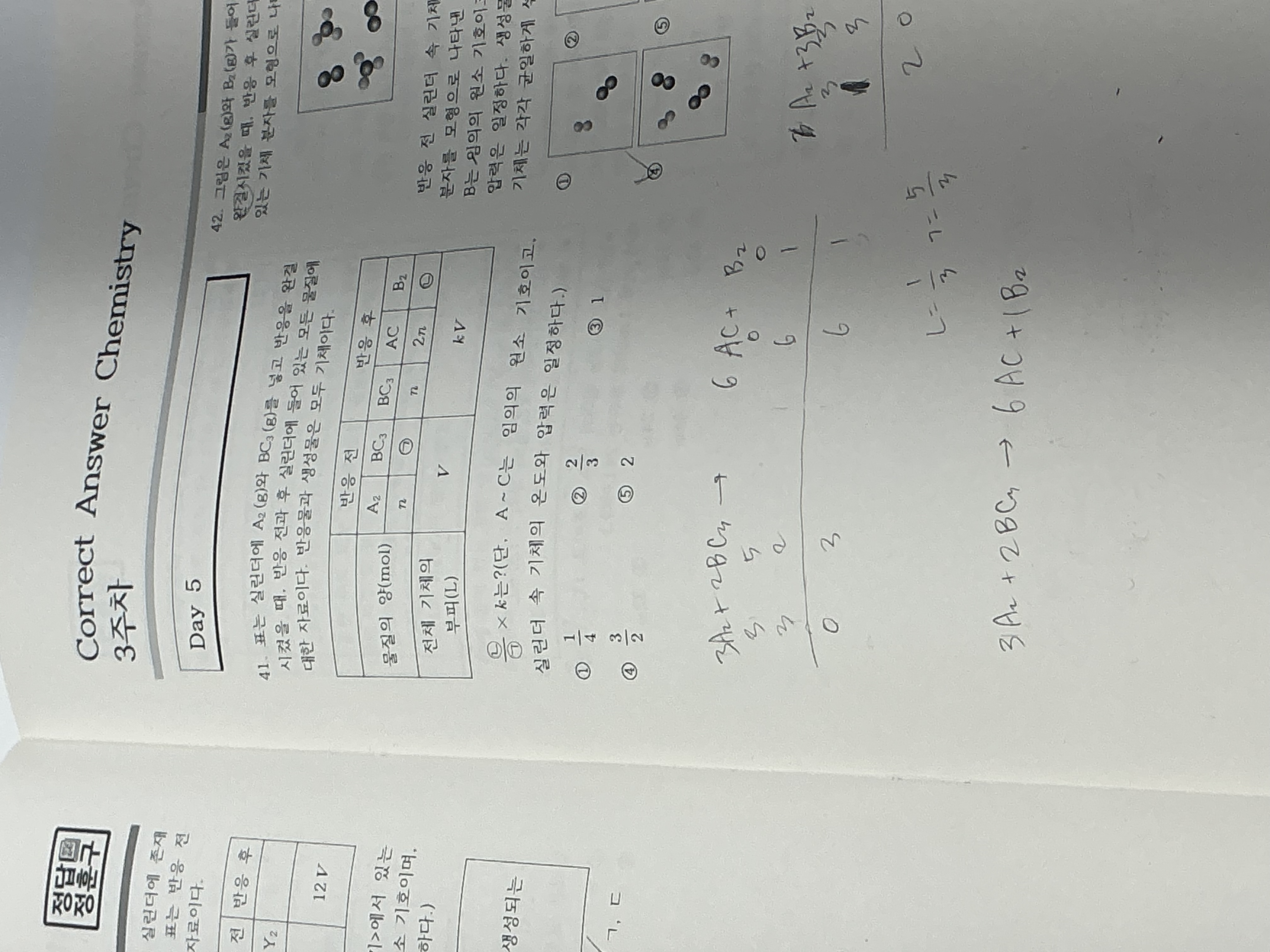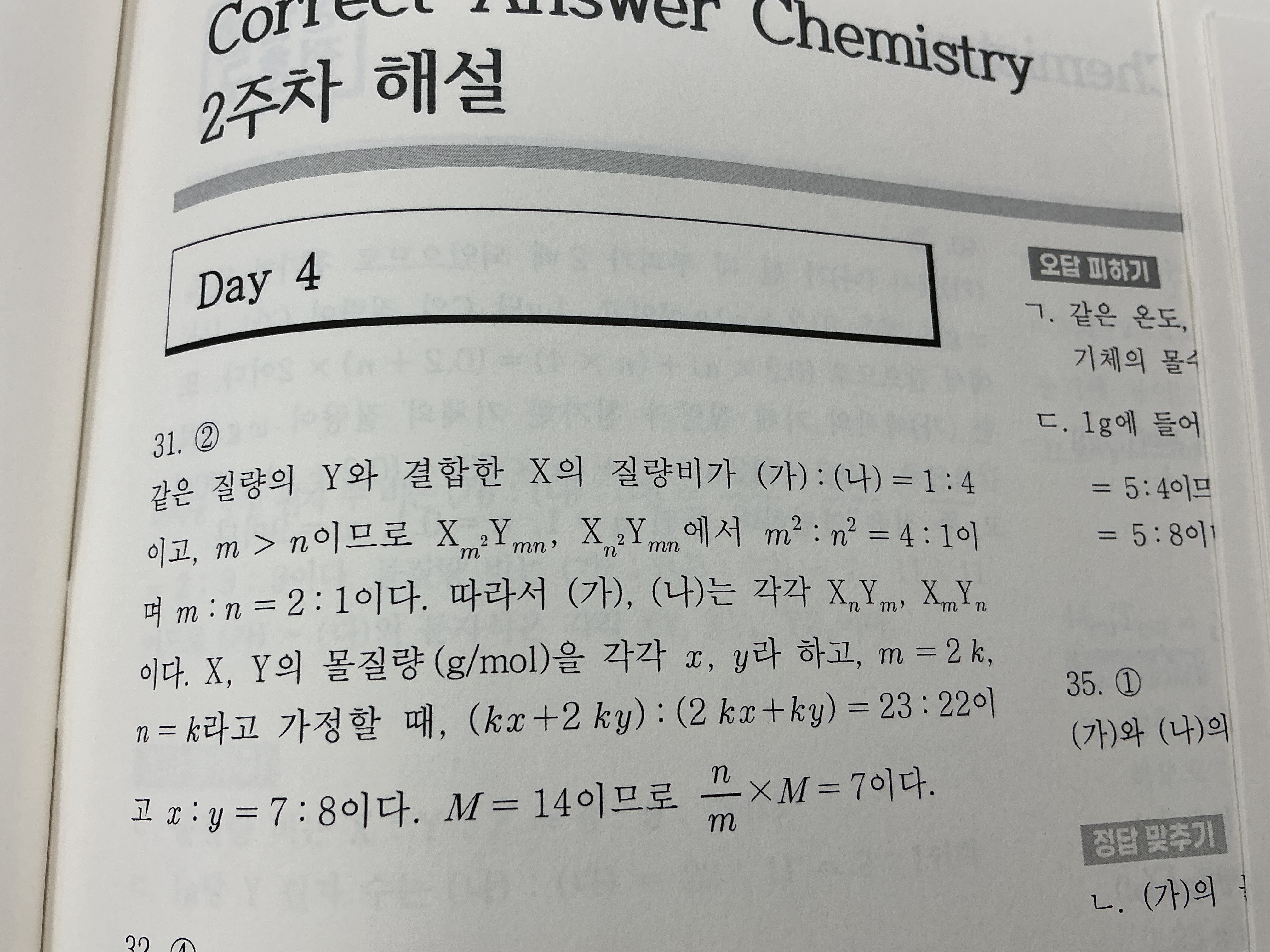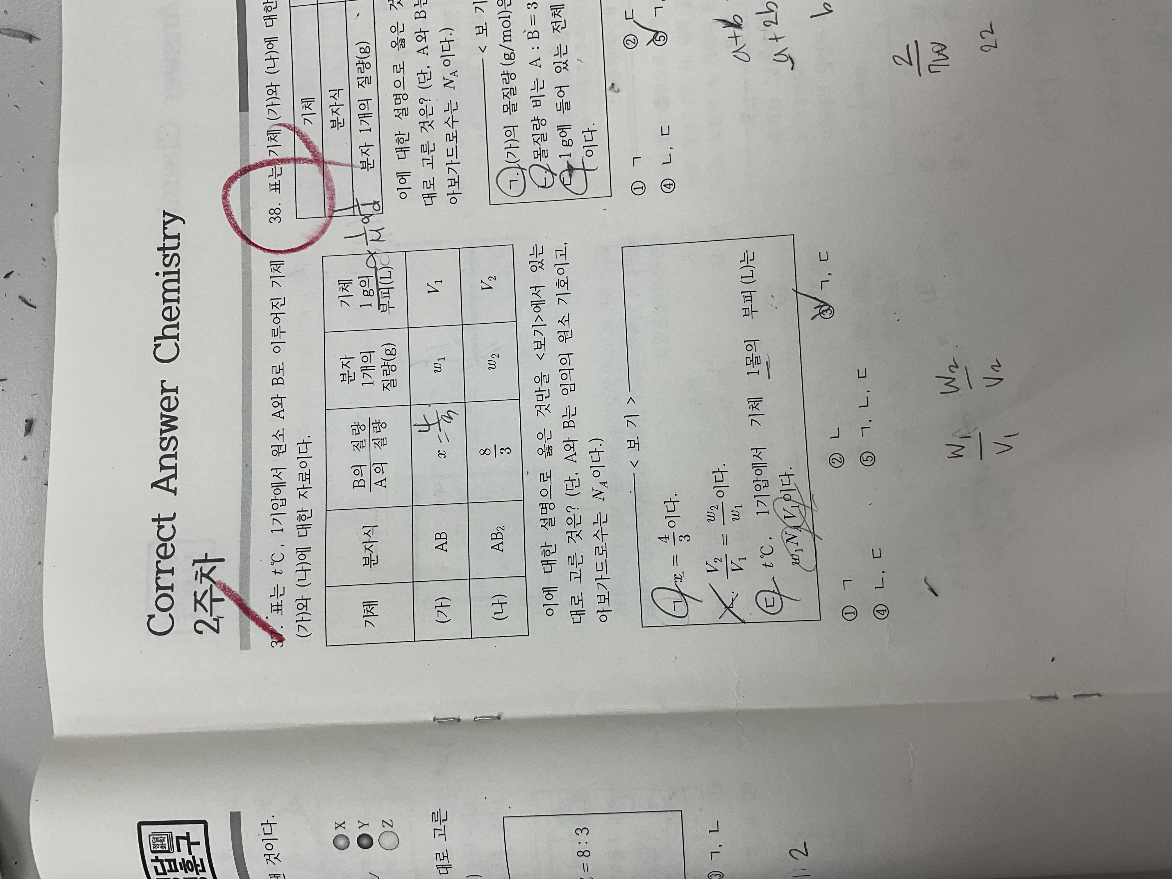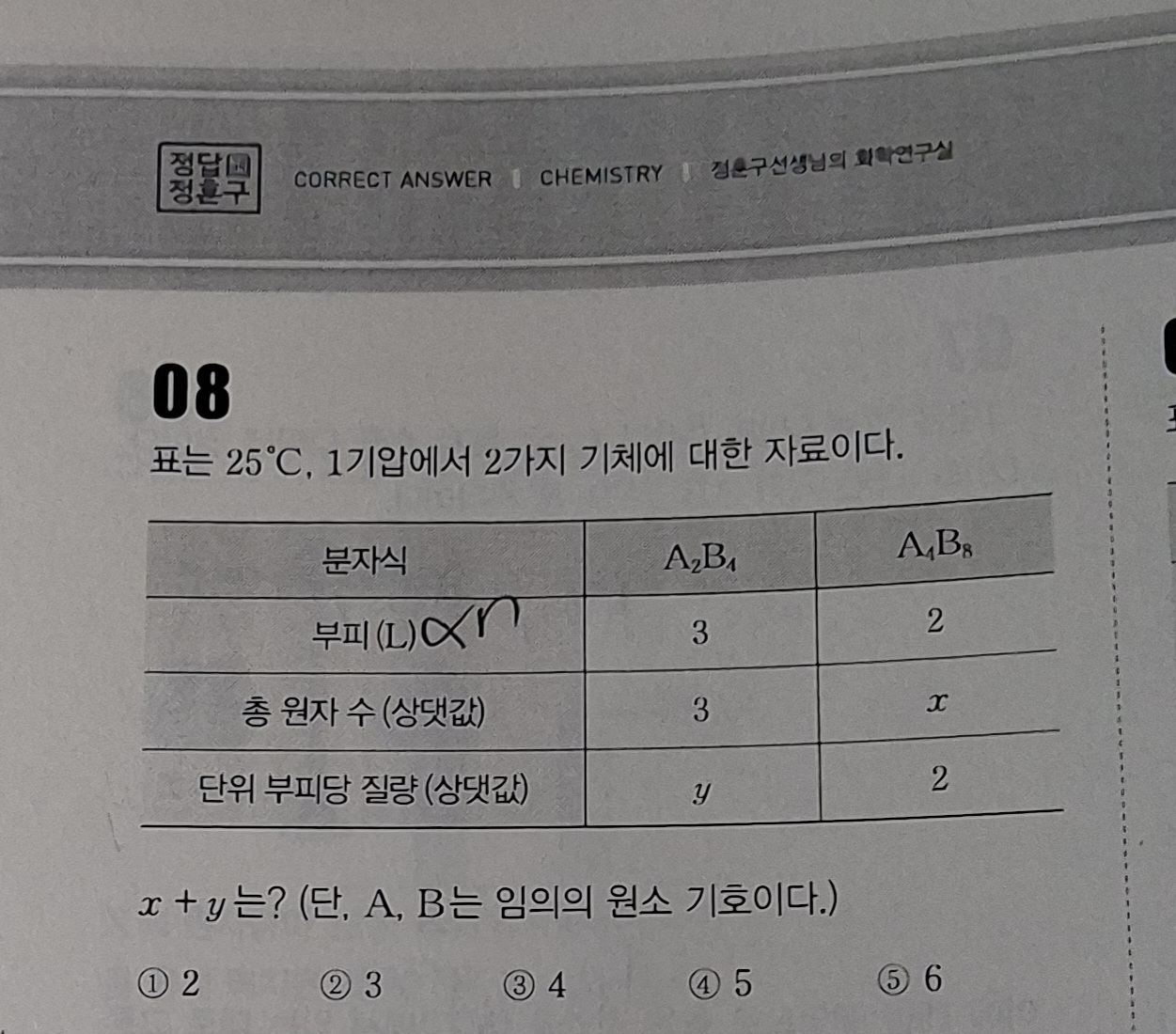 y값 구하는 과정에서 A2B4랑 A4B8이 분자량이 1:2 라서 단위 부피당 질량도 1:2여서 y=1 로 구하는 문제인데 둘이 몰비가 다르니깐 분자량 비가 k/3: k/2 라고 하면 안되는 이유가 뭔가요?