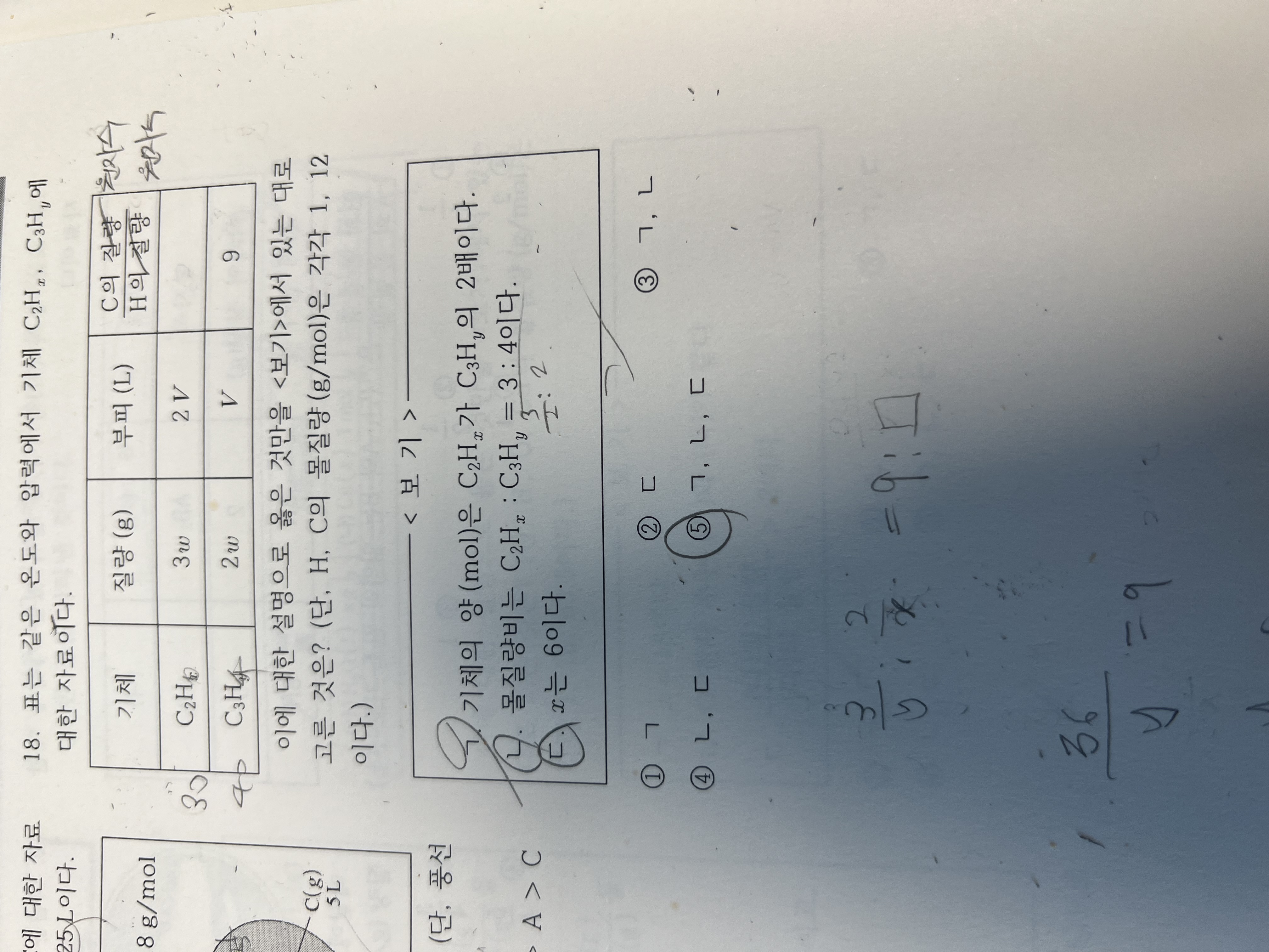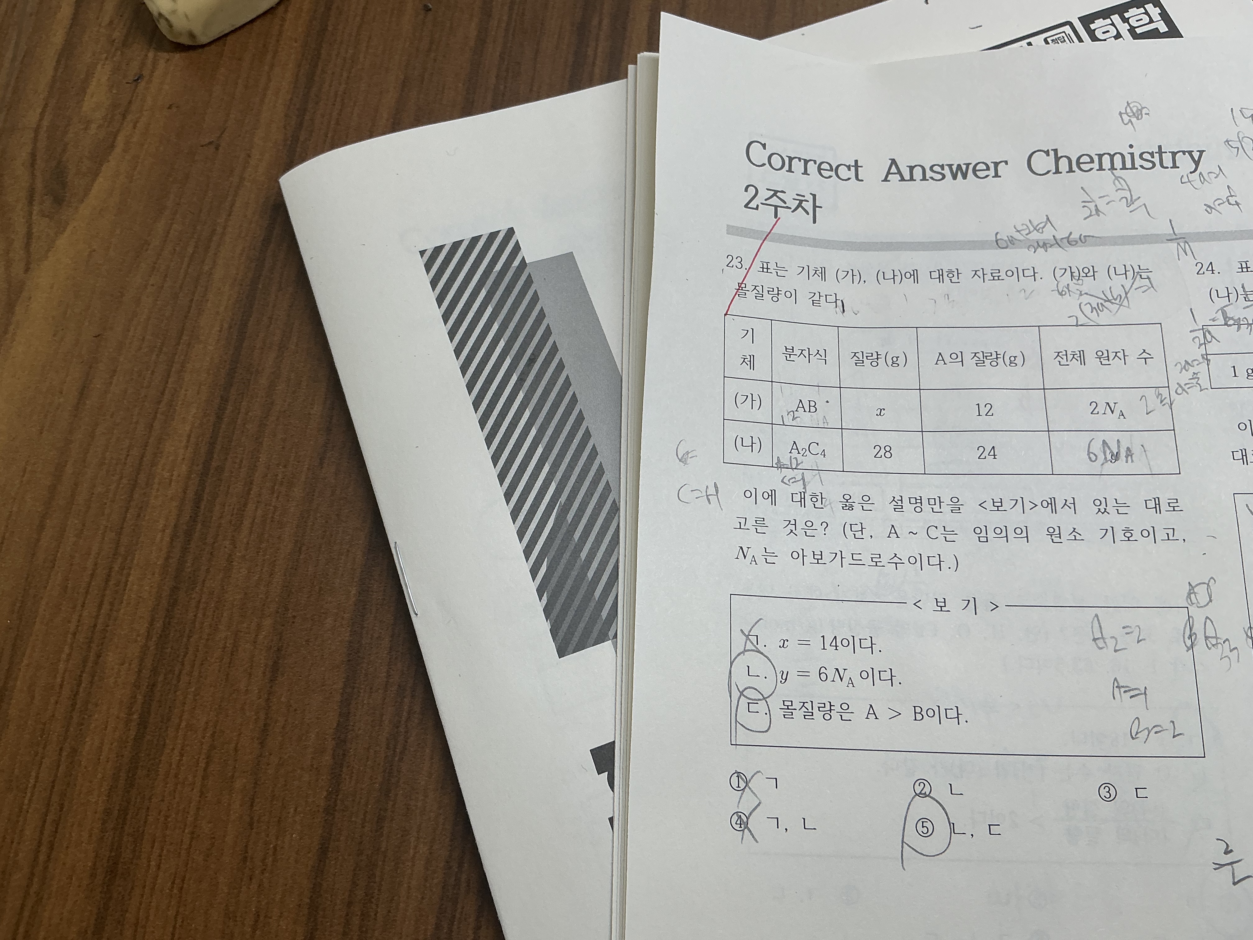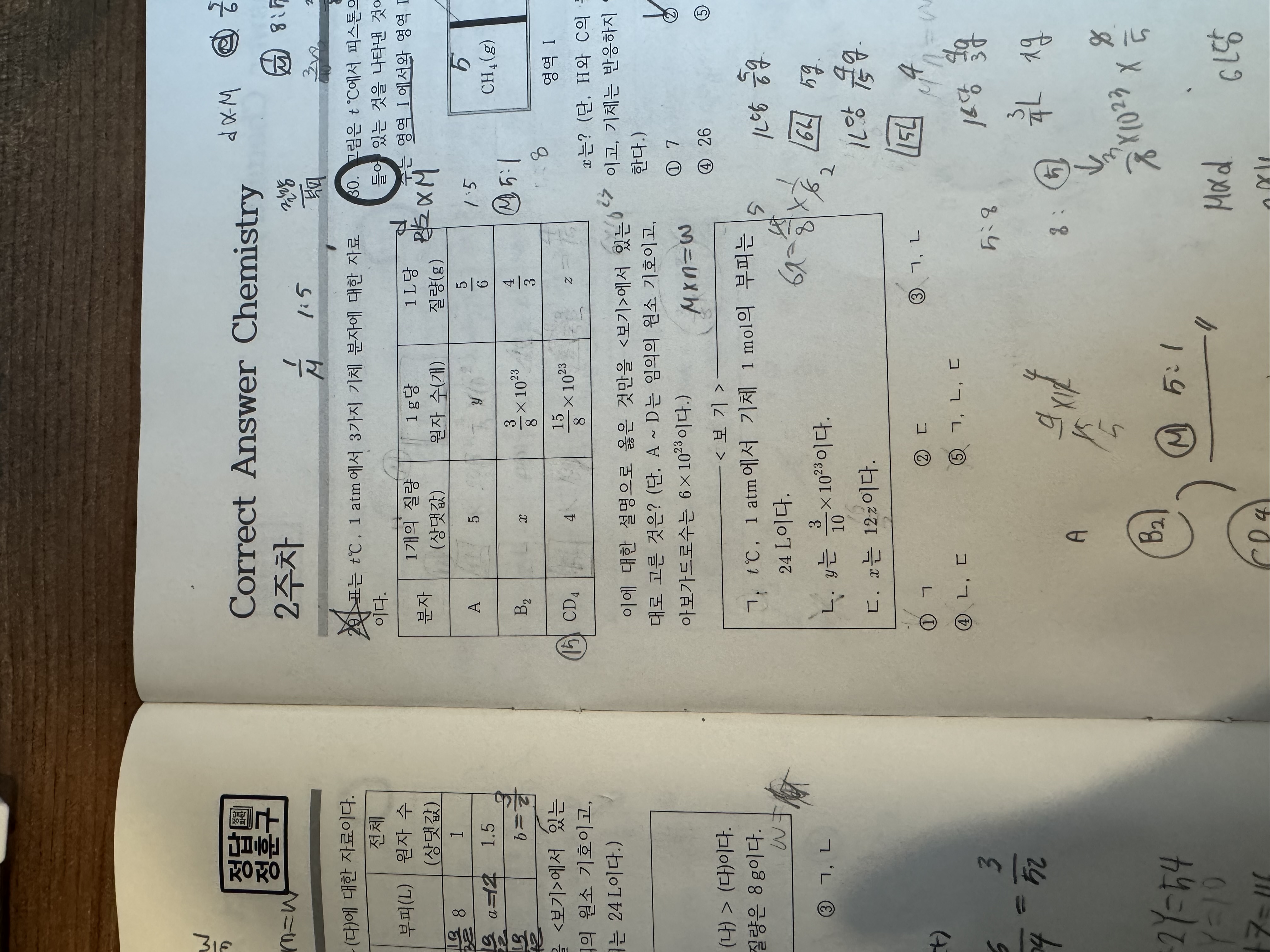 우선 첫번째 줄의 계산 과정이 어떻게 유도된 건지 잘 모르겠습니다. 그리고 질량비랑 몰질량비는 같은 관계인 건가요.? 4:5에서 16:20으로 가는 과정이 궁금합니다.