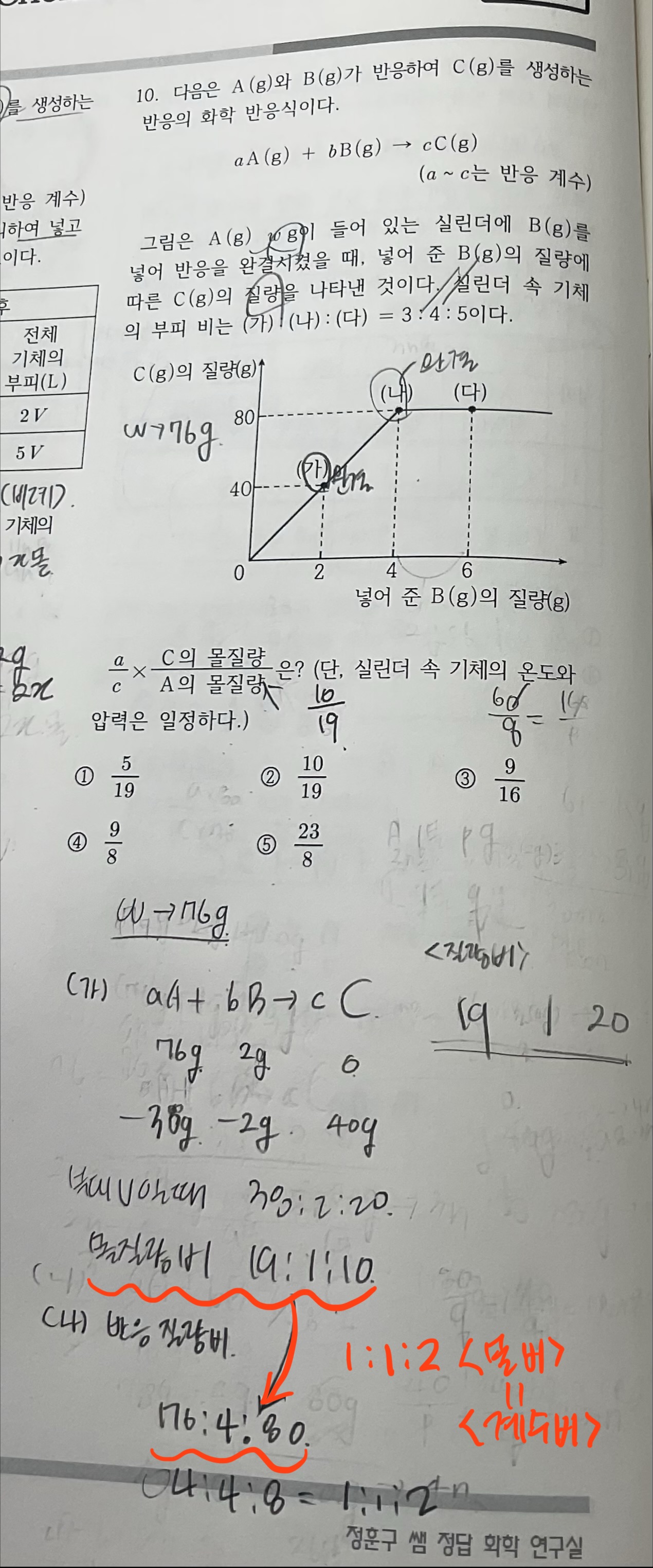 22개정화학 4주차 과제물 10번 문제입니다 문제 안에서 질량비가 19:1:10 인 것까지는 찾았는데 이후로 몰질량 비를 사용해 반응 질량비가 어떻게 계수비로 연결되는지 모르겠어요 / 좀 더 간단한 풀이방식이 있다면 문제 풀이 방식도 같이 알려주시면 좋겠어요 감사합니다